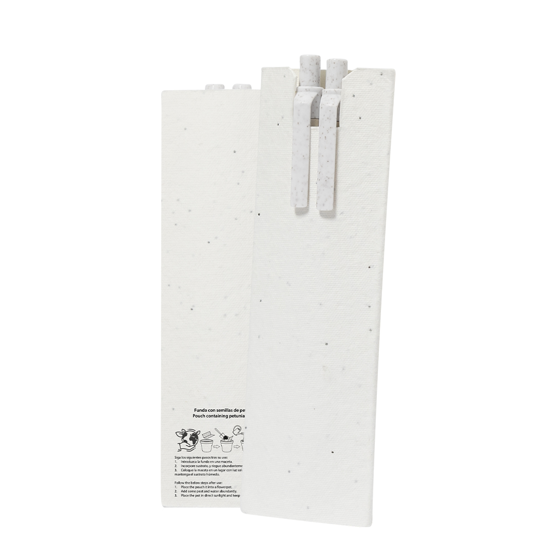 Set de bolígrafo y lápiz eterno fabricados con cartones de leche reciclados, presentados en funda de papel con semillas. Bolígrafo de tinta azul y lápiz con punta eterna, para así usar siempre el mismo lápiz y no generar residuos, ambos con mecanismo pulsador y clip a juego fabricados en Caña de Trigo, con distintivo grabado. Con distintivo de cartón de leche reciclado en el cuerpo. La funda incluye semillas de petunia, convirtiéndolo en papel plantable al final de su vida útil. Incluye instrucciones de plantado en la cubierta trasera.Los Cartones de Ceche se componen en su mayor parte de cartón y aluminio. Durante su proceso de reciclado, se separan los distintos materiales del envase para su reutilización y nuevo uso, contribuyendo así a recorrer el camino infinito de la economía circular. Este material se caracteriza por su alto grado de reciclabilidad, así como por su ligereza y resistencia.La Caña de Trigo fomenta la utilización de materias primas naturales, reduciendo así las emisiones contaminantes.