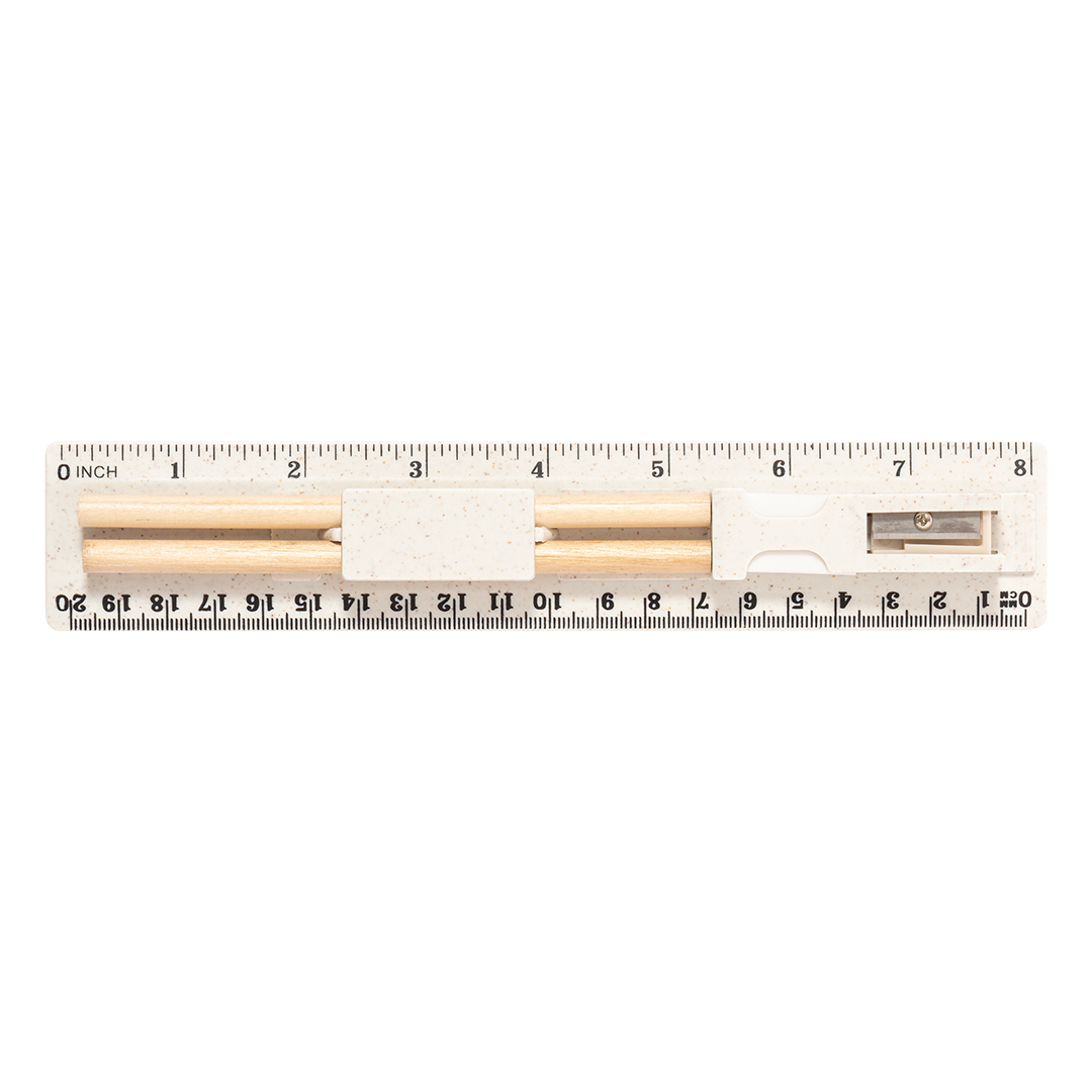 Set de 5 piezas fabricado en caña de trigo. Incluye 2 lápices de madera con mina negra y cuerpo cilíndrico blanco; goma y sacapuntas. Presentado en estuche/regla de 20 cm/8 pulgadas, con compartimentos para los distintos elementos del set. Presentado individualmente en una bolsa de papel blanca. La caña de trigo fomenta la utilización de materias primas naturales, reduciendo así las emisiones contaminantes.