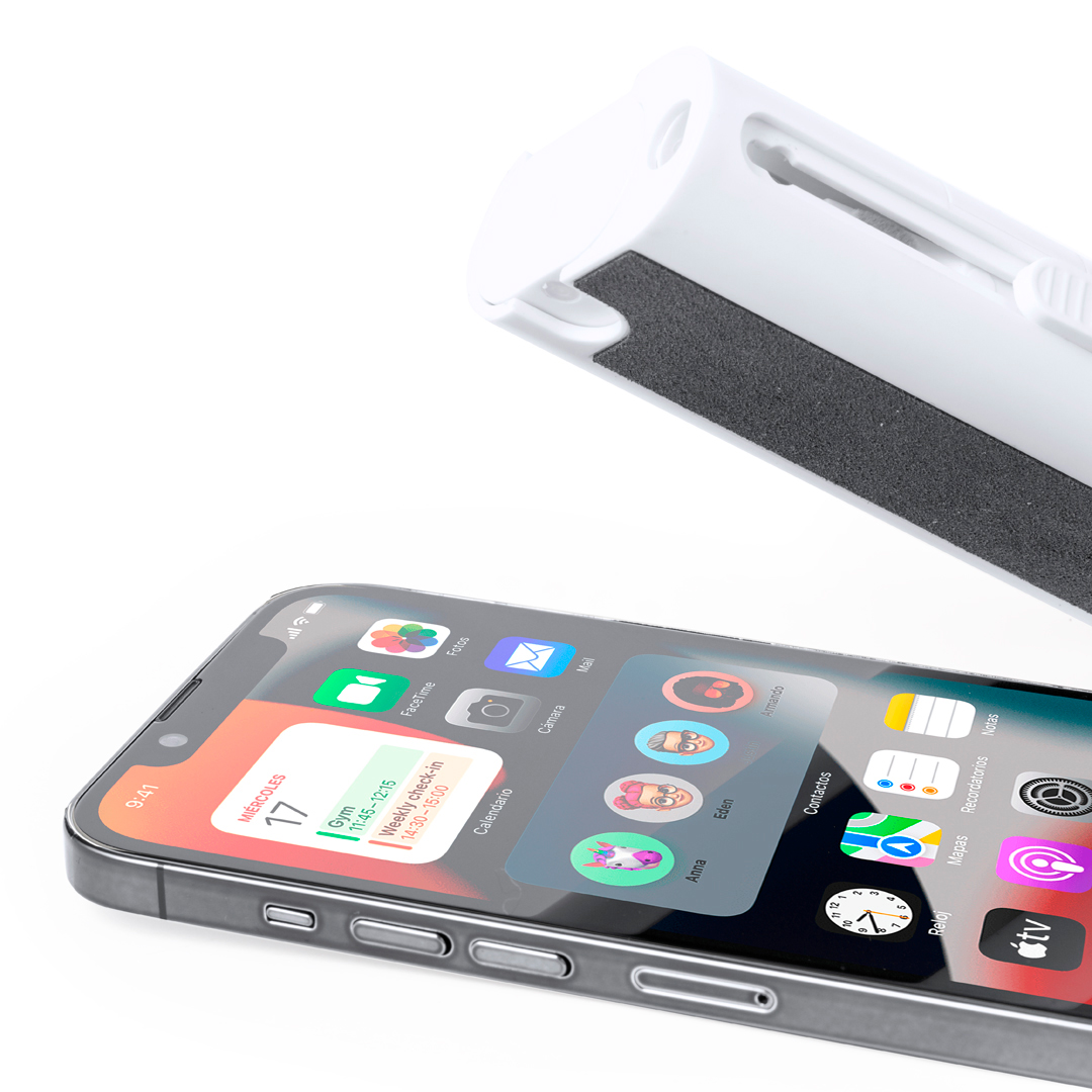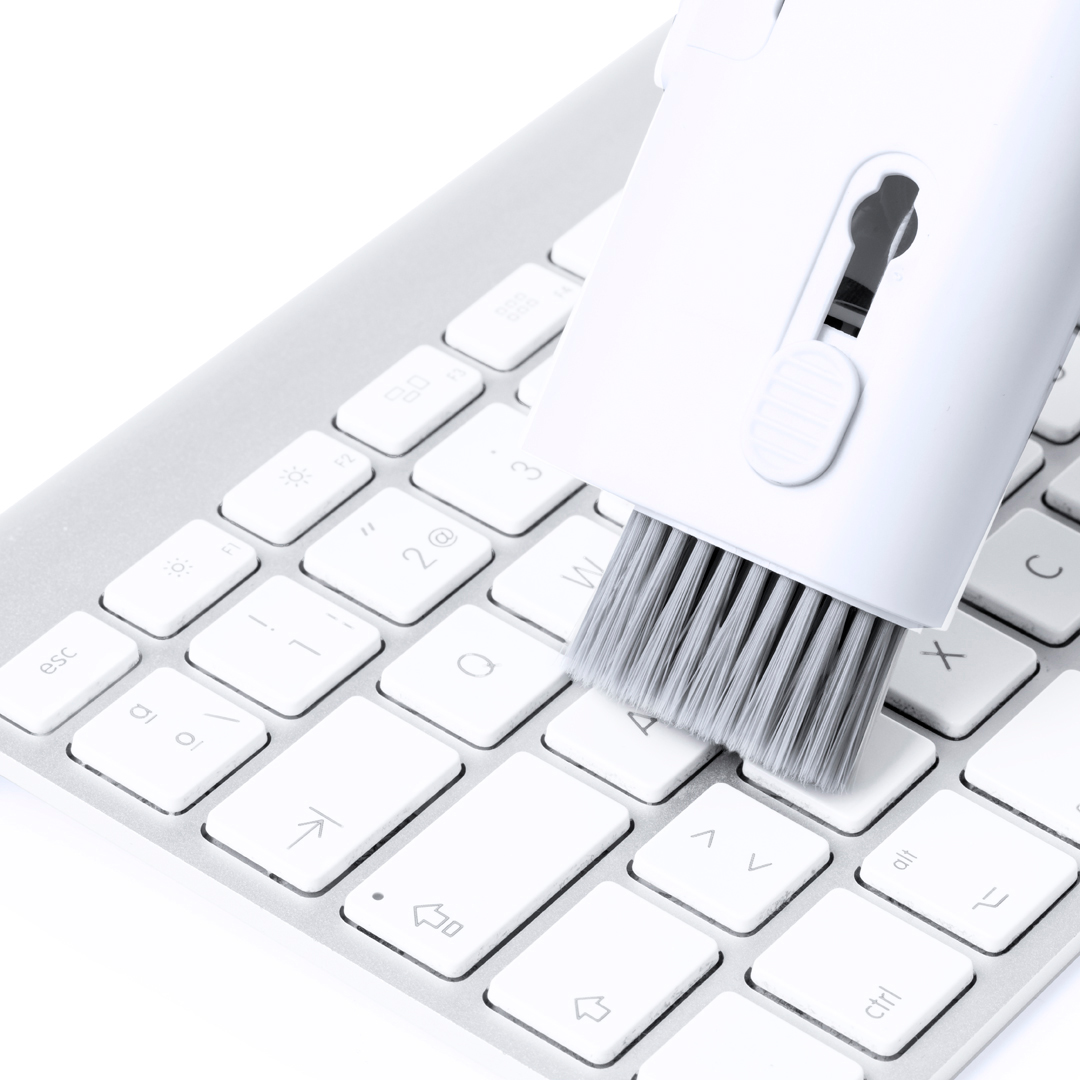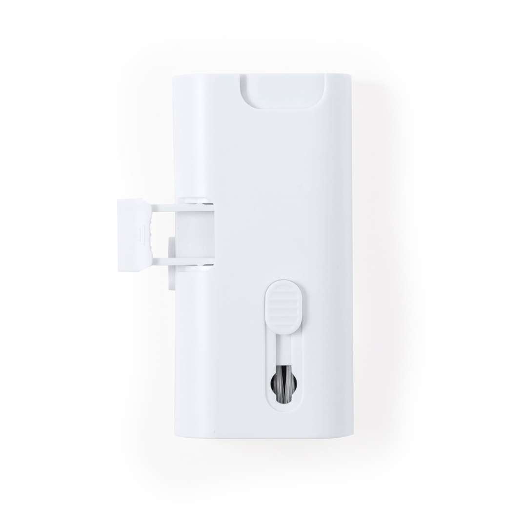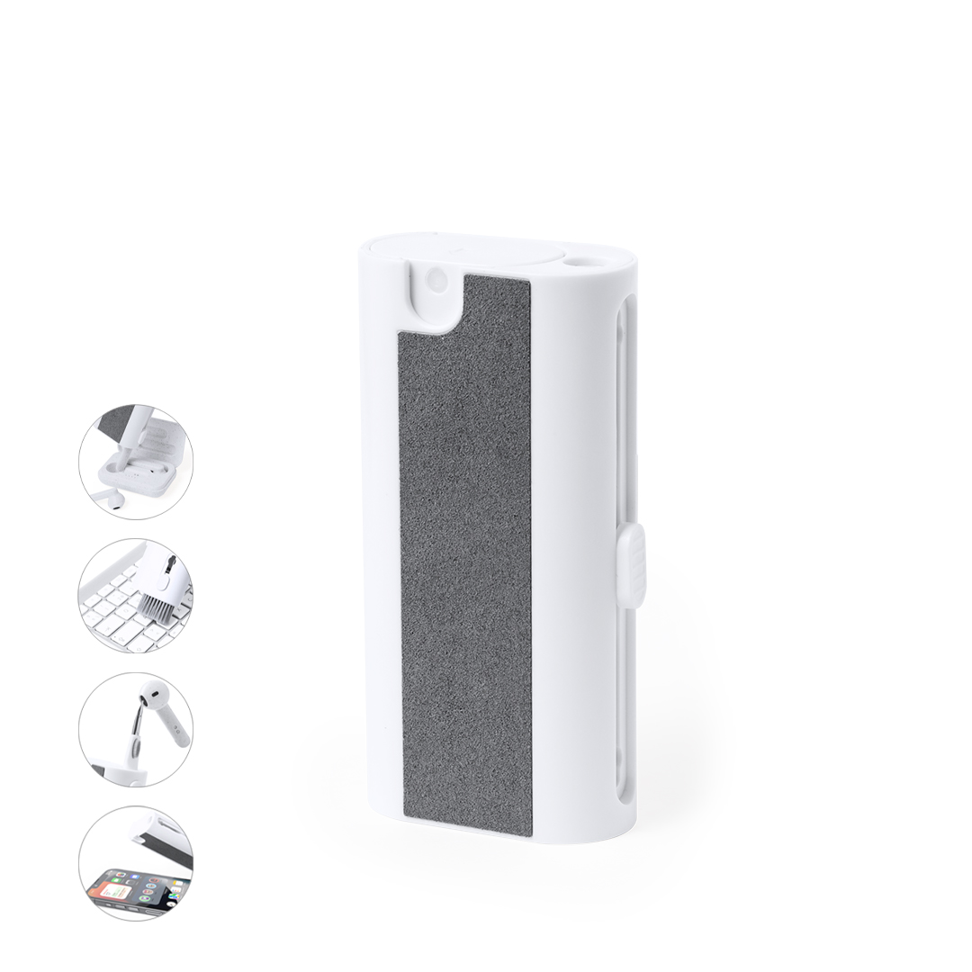 Completo set de limpieza de 6 funciones, especialmente diseñado para el cuidado y mantenimiento de los gadgets tecnológicos. Todos los accesorios se alojan en el interior de la carcasa y se están listos para usar deslizando el botón correspondiente a cada uno de ellos. Incluye depósito interior rellenable con pulverizador, zona limpia pantallas, punta metálica, bastón limpiador, cepillos de diferentes formas y accesorio para extraer teclas. Fabricado en resistente ABS, con elegante diseño en color blanco y presentado individualmente en caja de diseño kraft.