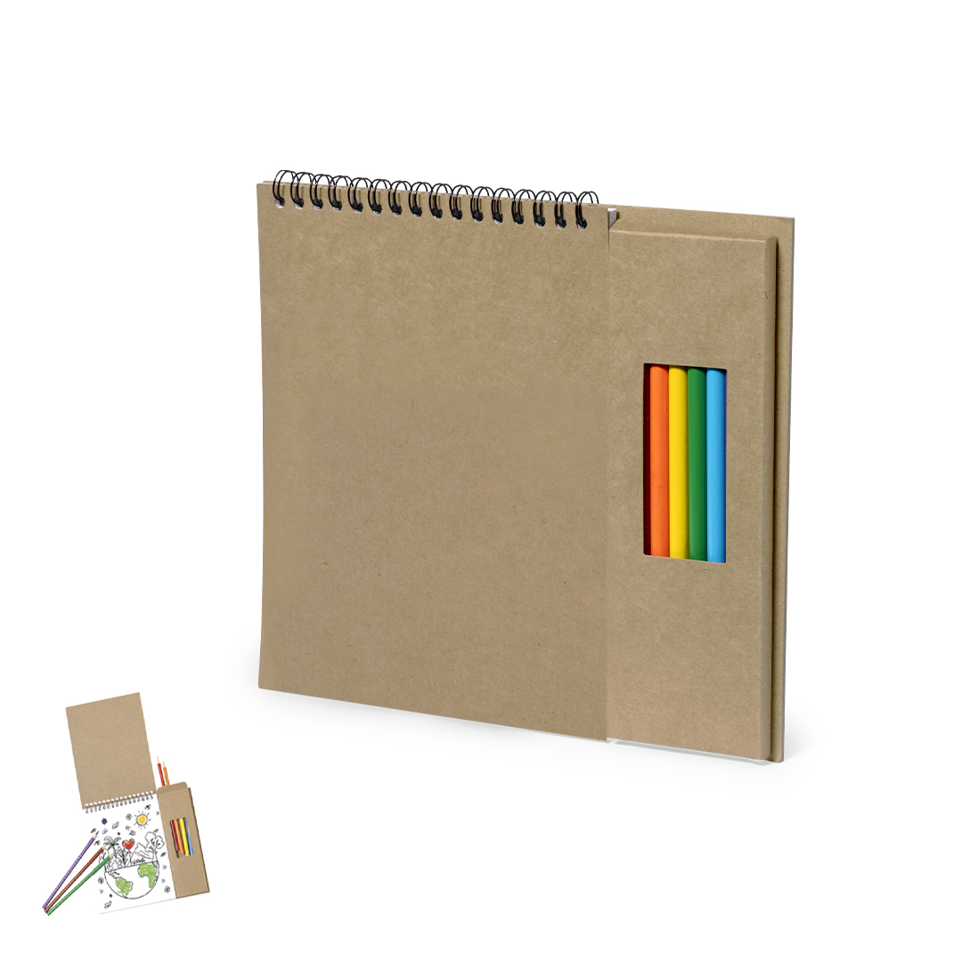 Fantástico set de lápices y bloc hecho en cartón reciclado. Contiene estuche con ventana de 8 lápices con cuerpo hexagonal de variados colores y un bloc de notas de anillas con 6 hojas de motivos naturales y 18 páginas en blanco.
