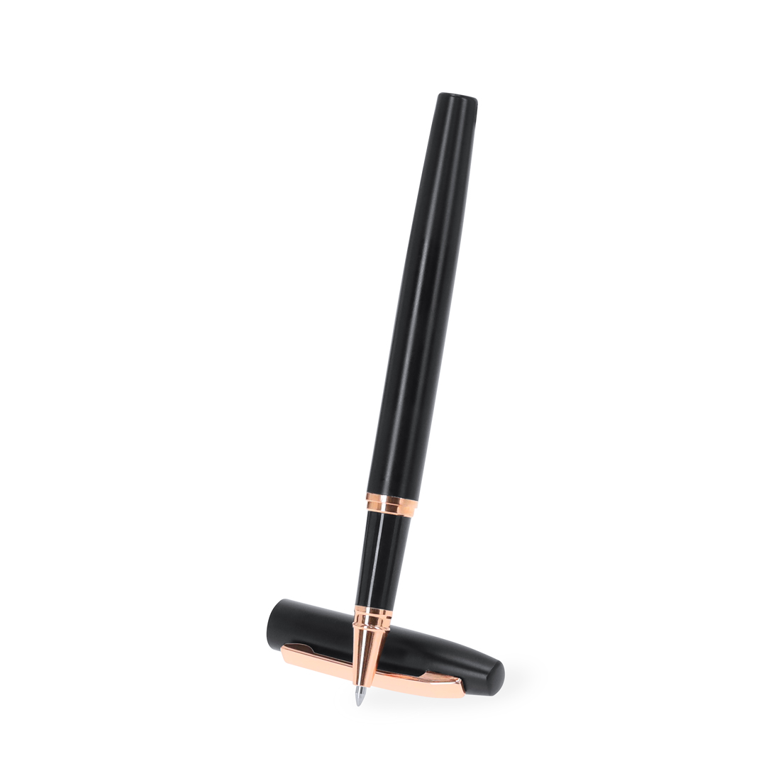 Set de bolígrafo y roller fabricados en Aluminio Reciclado, en elegante diseño negro mate con distinguidos accesorios en acabado oro rosa. Bolígrafo de mecanismo giratorio y roller con capucha, ambos con clip metálico. En tinta azul y logotipo de Aluminio Reciclado. Presentación en elegante estuche negro.El Aluminio Reciclado es un material con posibilidades de reciclaje casi infinitas, sin perder sus propiedades originales y consumiendo menos energía en este proceso.Certificación GRS (Global Recycled Standard / Estándar de Reciclaje Global), que garantiza el origen reciclado del material usado para fabricar el producto.