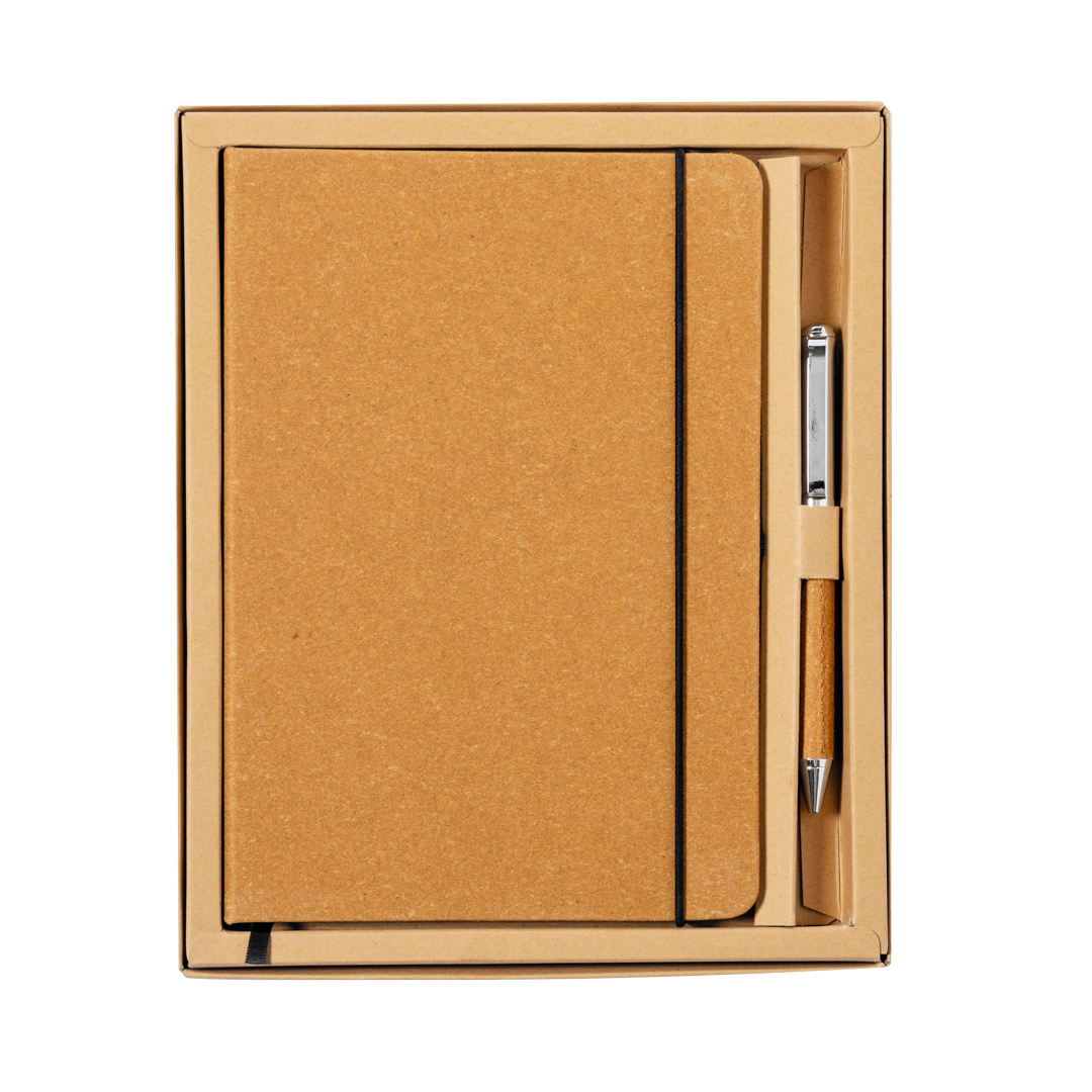 Set de bloc de notas y bolígrafo en cuero reciclado. Incluye: Bloc de notas con tapas rígidas fabricadas en cuero reciclado. Interior con 100 hojas de disposición a una raya. Incluye marcapáginas, elástico de cierre y soporte para bolígrafo a juego. Con distintivo cuero reciclado en contraportada.Bolígrafo fabricado en metal cromado y con cuerpo recubierto en cuero reciclado. Elegante clip metálico y accesorios a juego. De mecanismo giratorio y en tinta azul, con distintivo cuero reciclado en cuerpo.Set presentado en estuche individual de diseño kraft, con compartimento independiente para bloc de notas y bolígrafo.El cuero reciclado rescata las fibras desechadas en los procesos de fabricación del cuero, minimizando el desperdicio de material, contribuyendo a reducir el impacto ambiental y manteniendo a la vez sus propiedades originales.