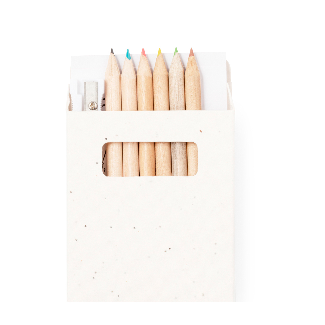Set de 6 lápices con plantillas para colorear y sacapuntas, presentado en caja de cartón natural con semillas. Lápices de madera con cuerpo redondo de acabado natural y minas en variada gama de colores. Incluye semillas de petunia en la caja, convirtiéndolo así en cartón plantable al final de su vida útil. Flores en colores surtidos, con instrucciones de plantado en la cubierta trasera.