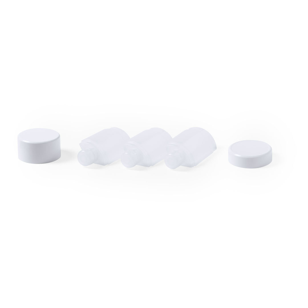 Set de viaje de 3 accesorios en resistente PP. Incluye 3 botes para gel y champú con cierre hermético. Presentado en estuche de original diseño.