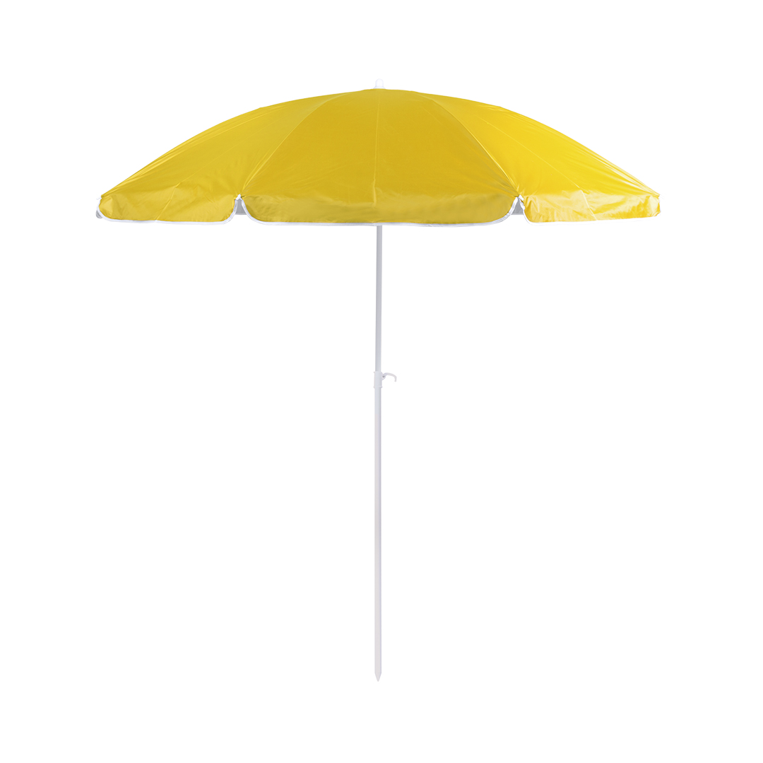 Sombrilla de playa de 8 paneles en resistente nylon. Interior en color gris plateado con protección UV, con tubo telescópico inclinable y ajustable en altura. 200cm de diámetro, con faldones laterales ribeteados, tubos metalizados en color blanco y disponible en una amplia gama de colores. Presentada en funda de nylon con cinta de transporte para hombro.