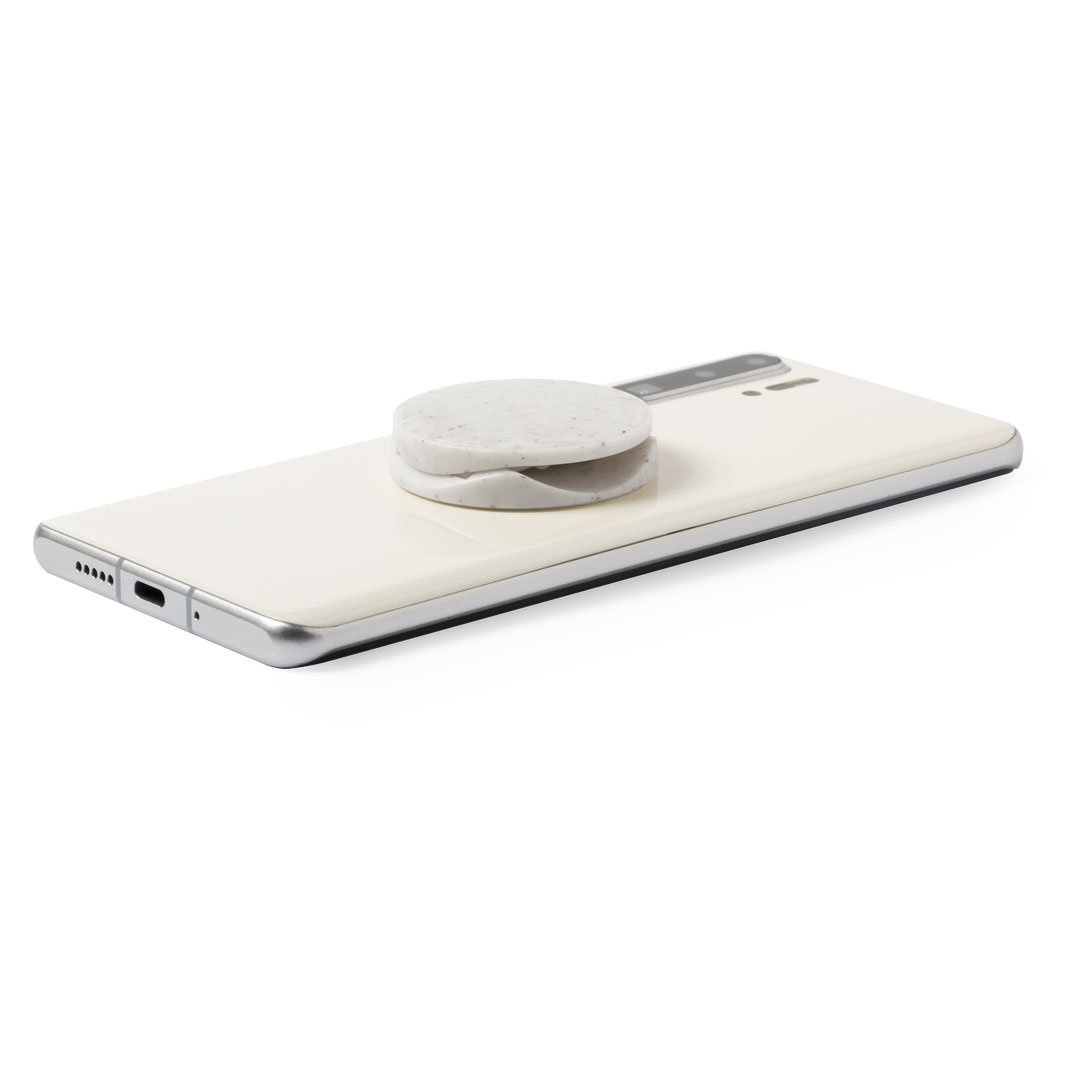 Soporte para smartphone plegable en línea nature, fabricado en caña de trigo, para así fomentar la utilización de materias primas naturales y reducir las emisiones contaminantes. Especialmente diseñado para marcaje en tampografía, con adhesivo 3M de fijación extra fuerte y libre de residuos al despegarlo del dispositivo.