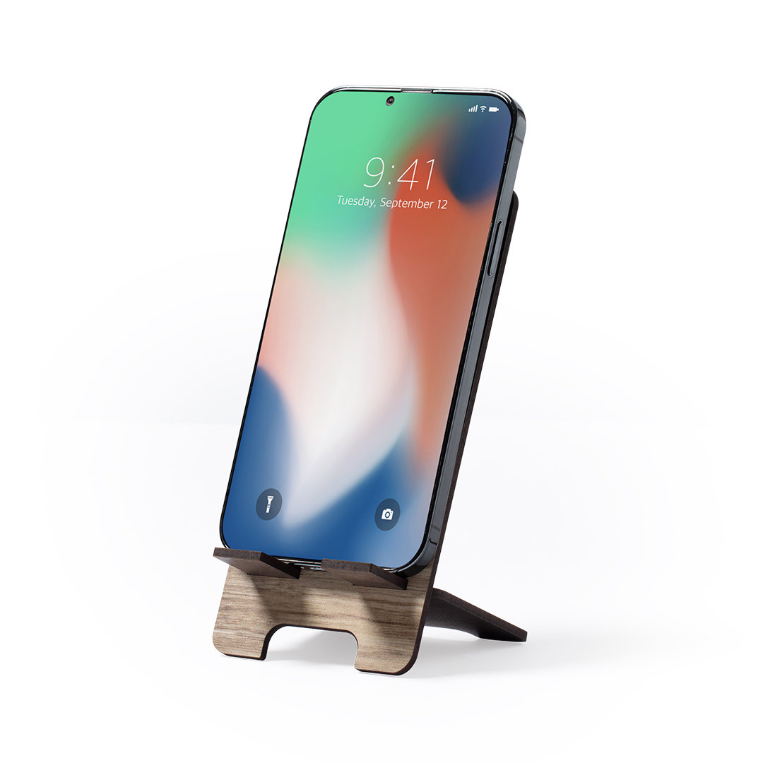 Soporte para smartphone con portafotos integrado. Fabricado en madera natural, con original acabado bicolor. Amplia superficie de marcaje, de fácil montaje y con distintivo Made In Europe.
