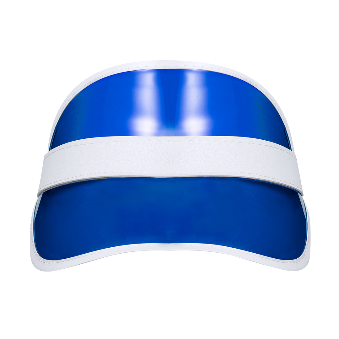 Original visera de PVC con protección UV. Acabada en colores transparentes en combinación con detalles de color blanco. Con cinta elástica ajustable y disponible en variada combinación de colores.